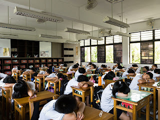 This shot comes from a series of pictures of school classrooms all over the world taken by Julian Germain. It's shot in Taiwan. After the kids have had lunch they just put their heads down on the desks and have a half-hour nap.
