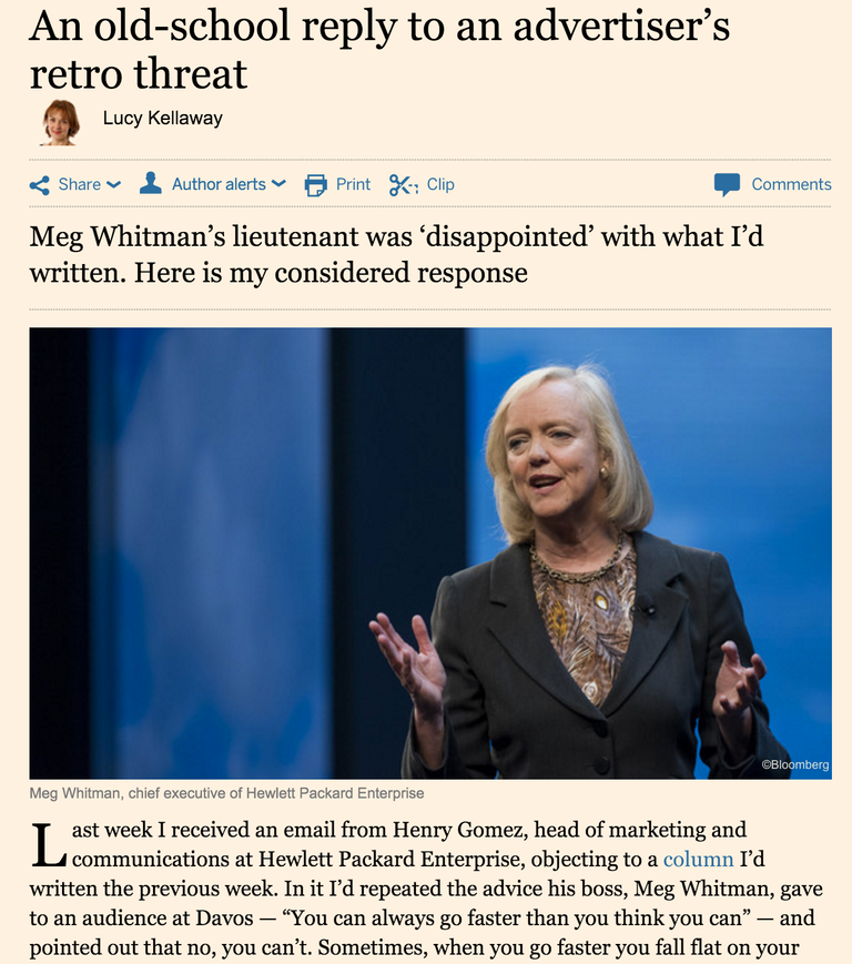 When FT columnist Lucy Kellaway was less than respectful about some airy fairy remarks made by Hewlett Packard boss Meg Whitman at Davos, a wise head of marketing and communications would have told his boss to just suck it up as the price you pay for speaking in public.